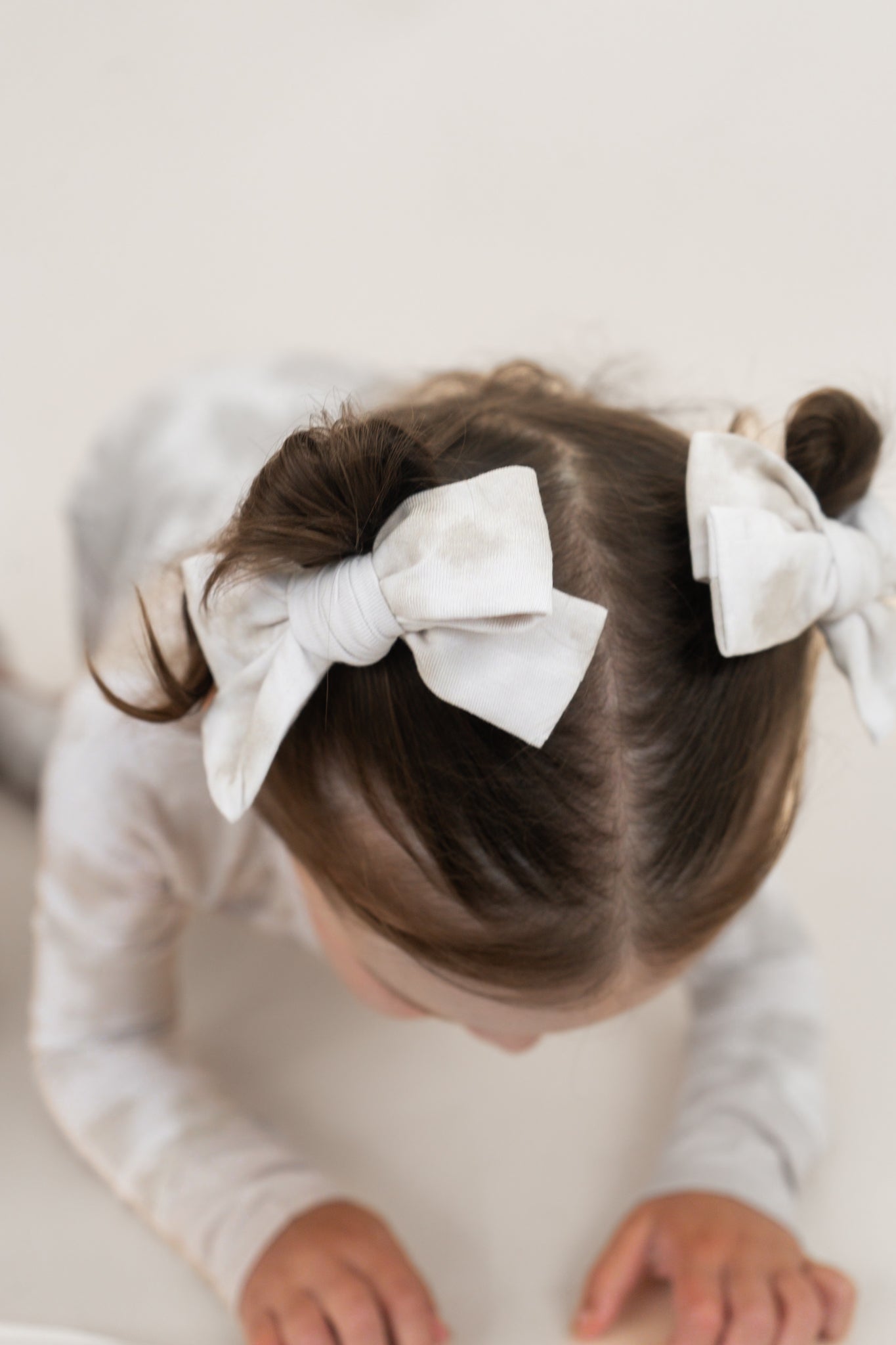 Dream big with our Sandy Shores Dream Bow Hair Clips! Made from soft, bamboo material, these hair clips feature a unique sandy tie dye pattern that adds a playful touch to any hairstyle. The perfect neutral bow to match any outfit, these clips will elevate your hair game.