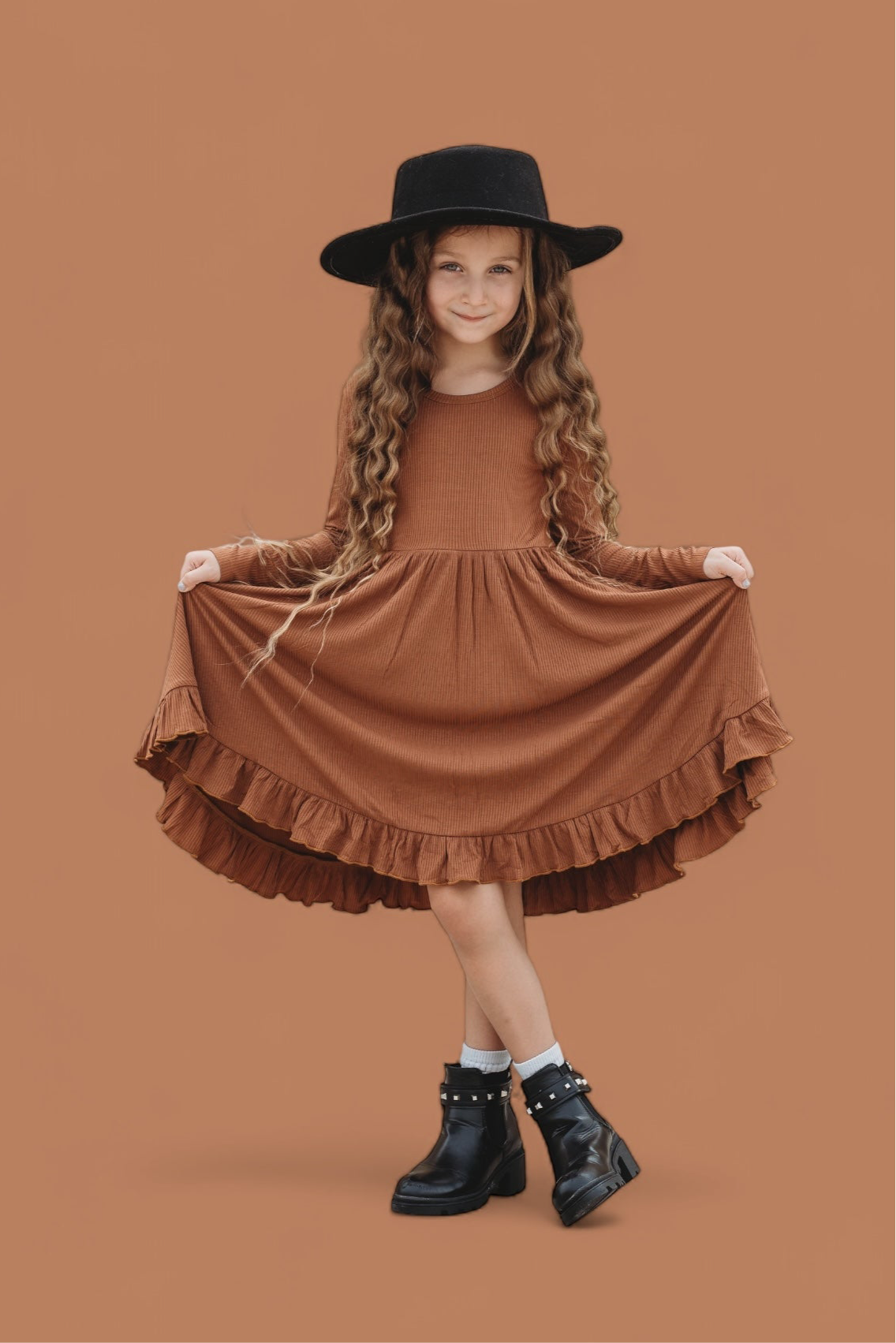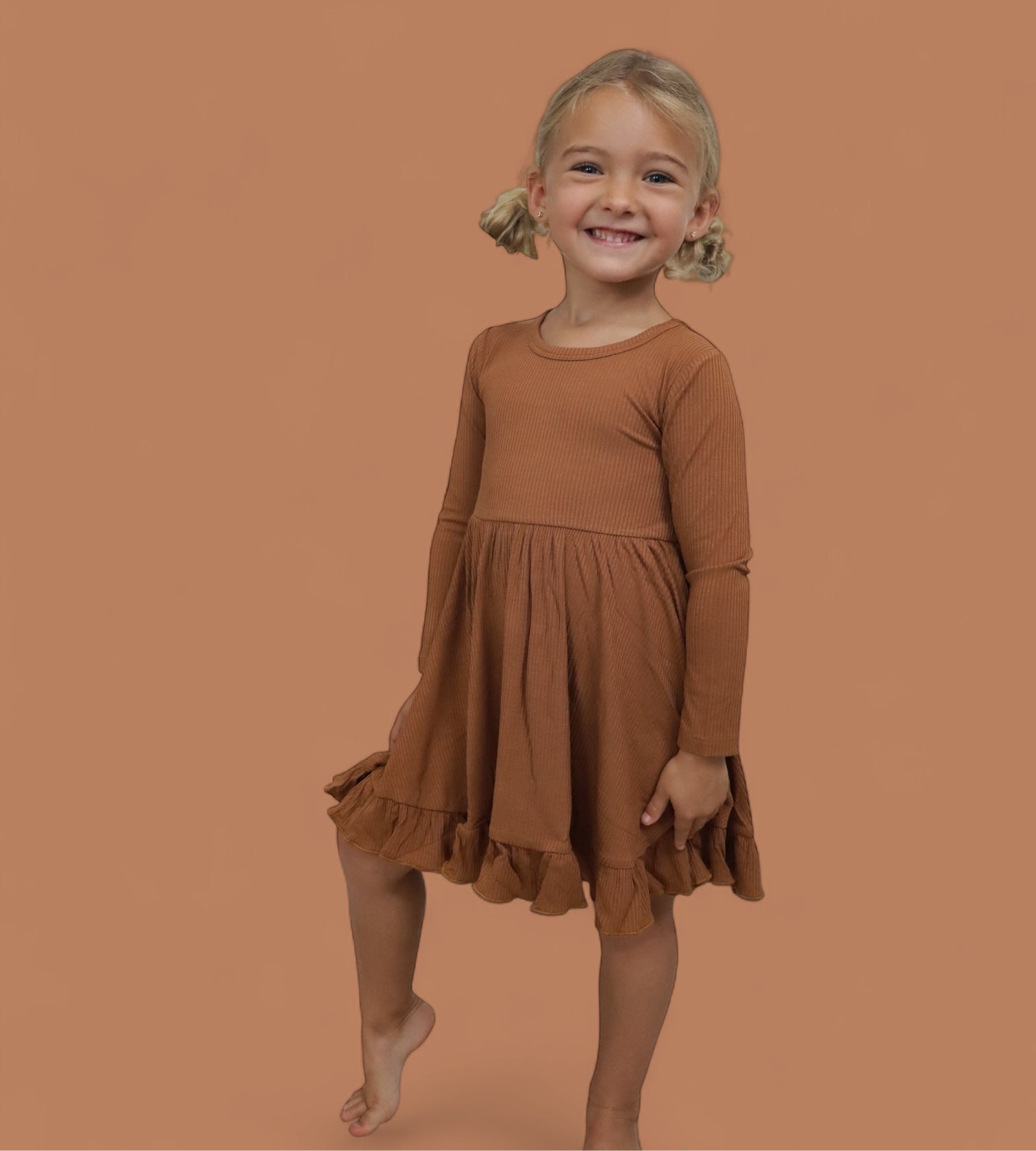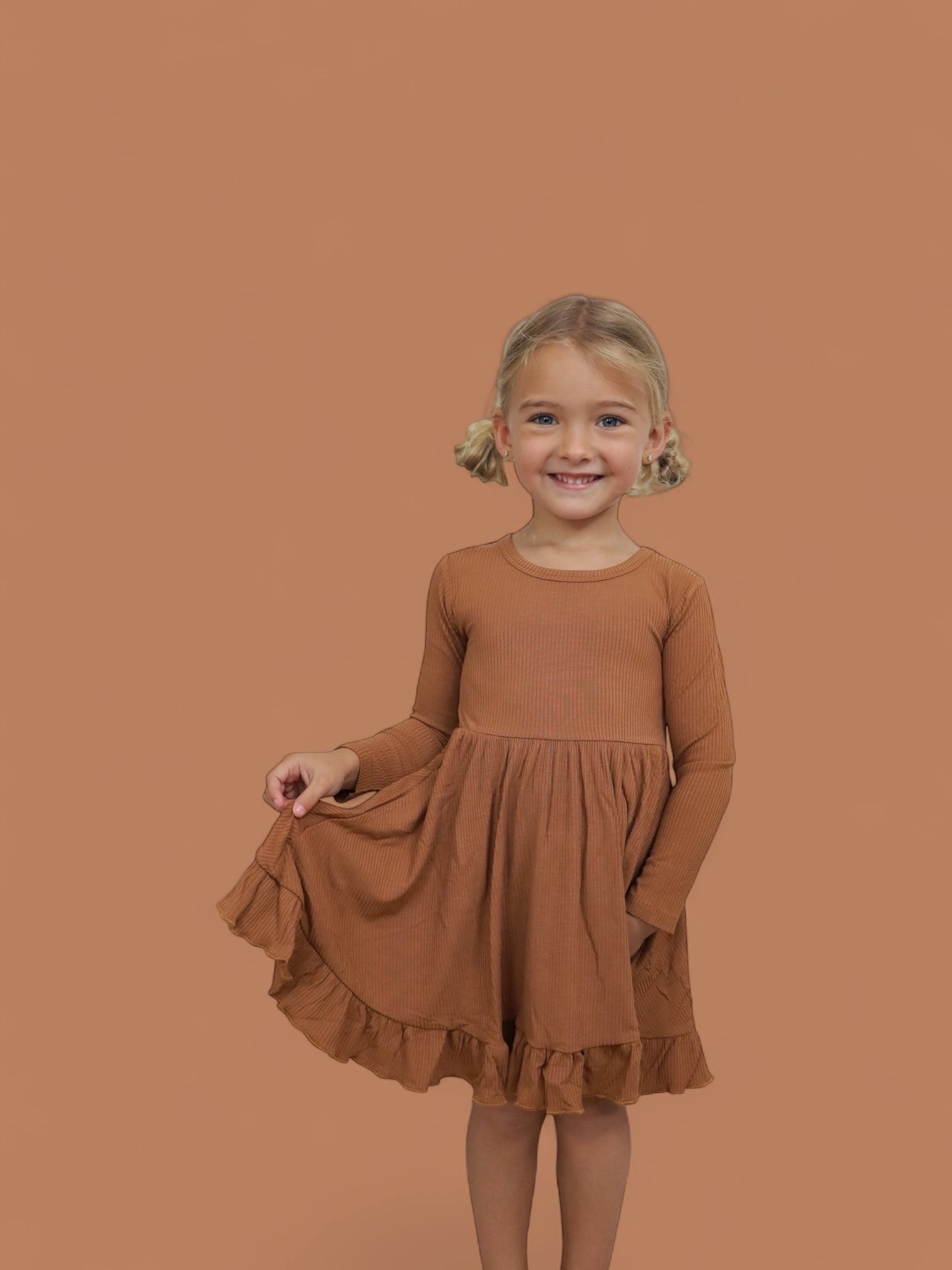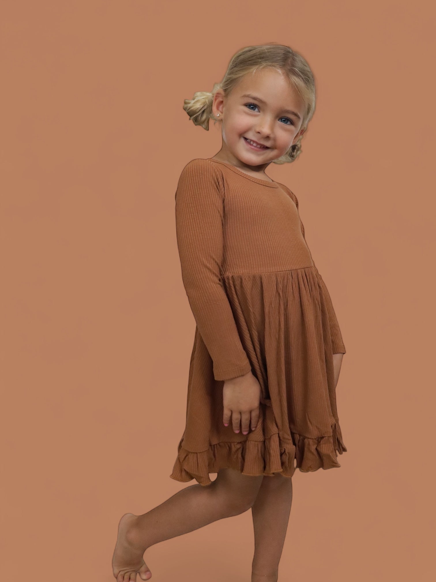 Simple, sweet, and made for twirls—the Espresso Long Sleeve Dream Ruffle Dress is the perfect blend of comfort and charm. Featuring a rich espresso hue and delicate ruffle detailing, this buttery-soft dress is ideal for fall outings, family photos, and cozy holiday gatherings. With long sleeves and a flowy silhouette, it’s an everyday favorite with a dressed-up feel.
