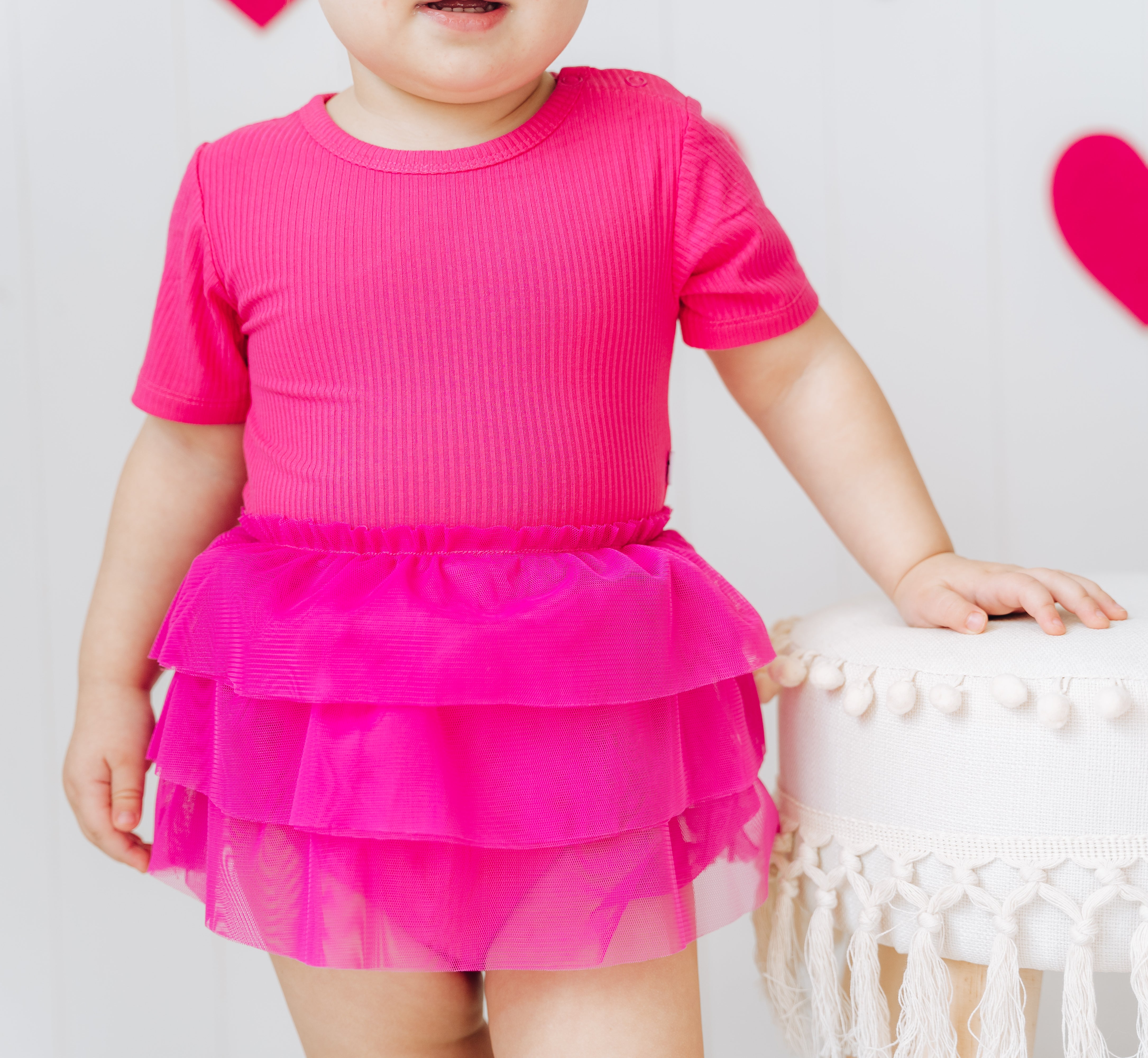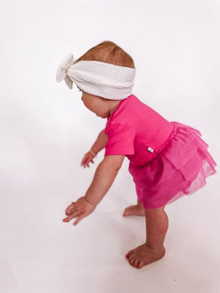 Be the envy of the playground with our Hot Pink Rib Dream Tutu Bodysuit Dress! Made of soft and breathable bamboo material, this short sleeve dress is perfect for all day wear. With a fun and flirty tutu design, your little girl will love twirling around in this dress.