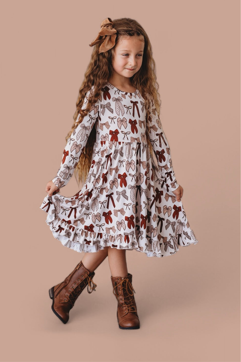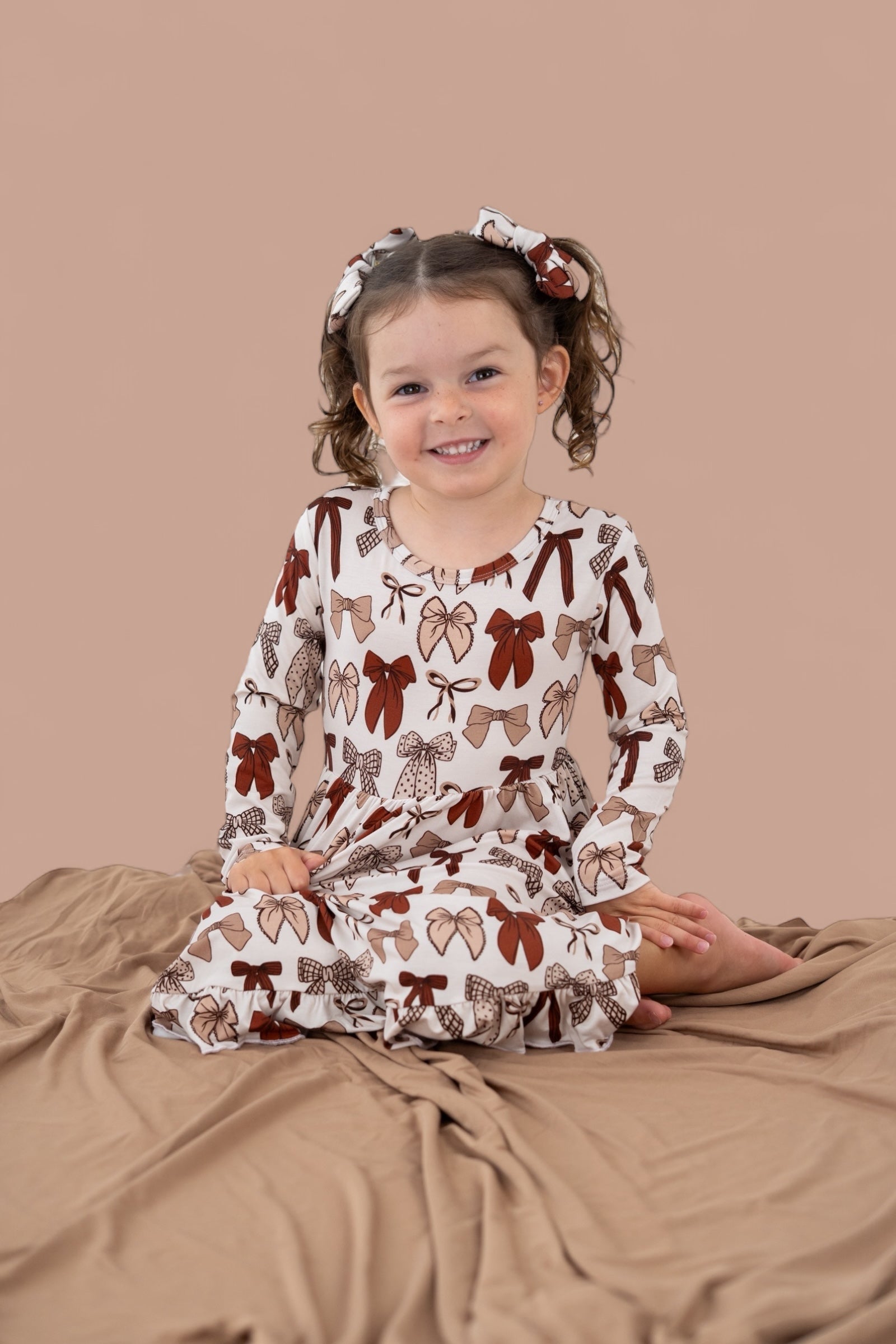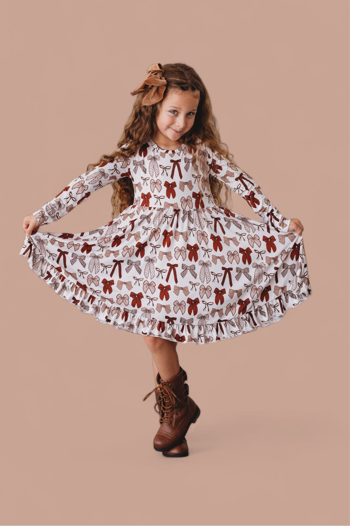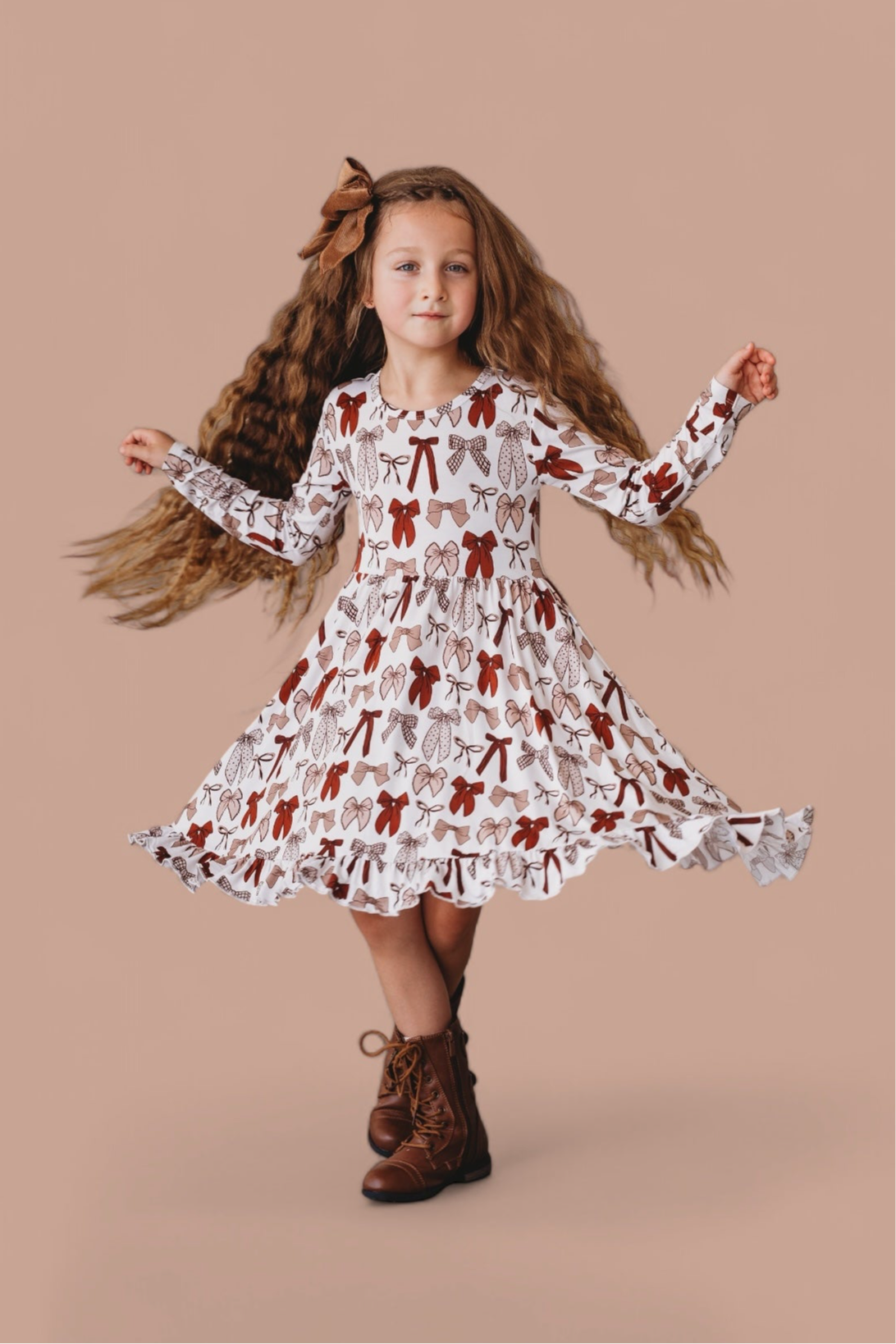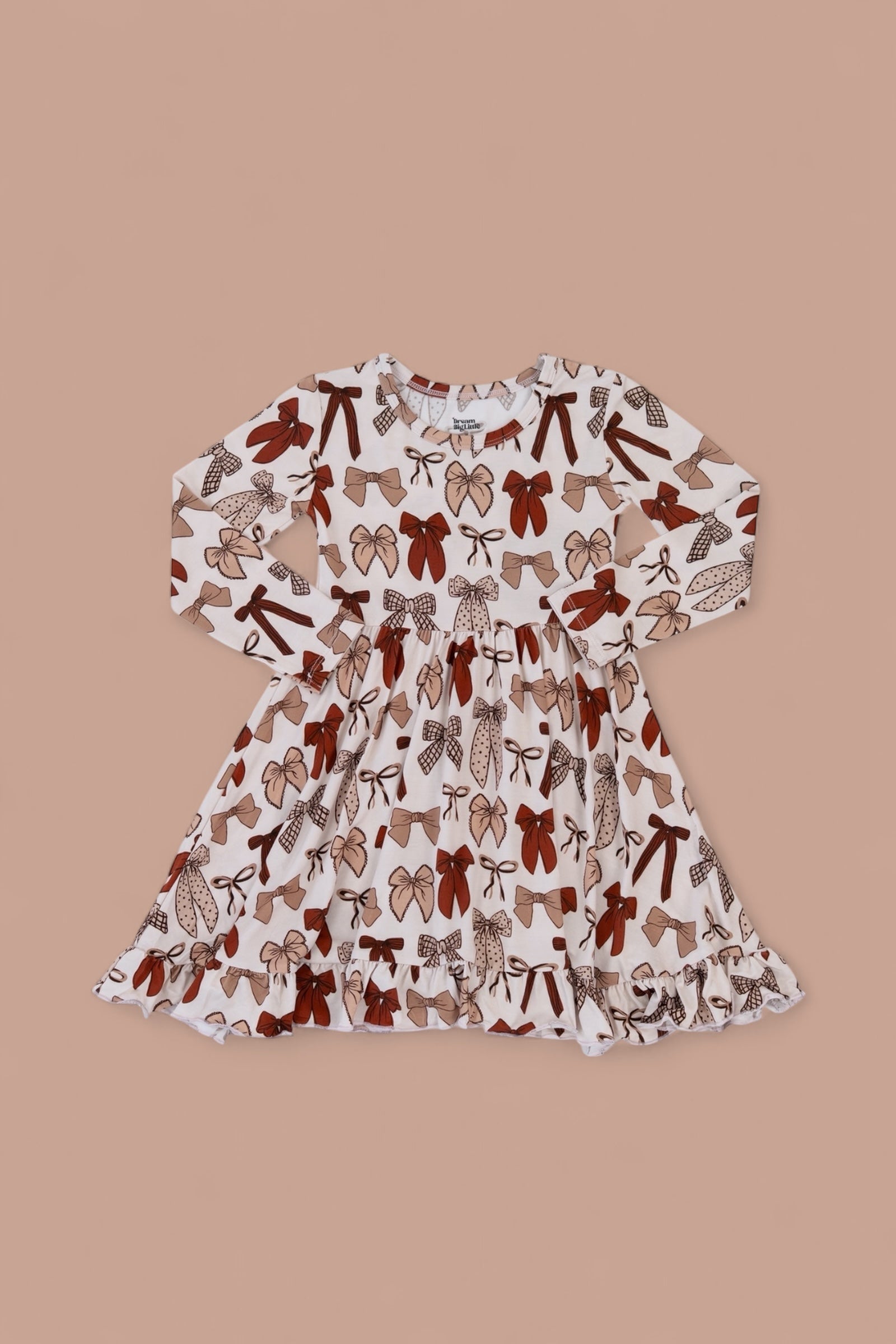 Bring on the autumn sweetness with our Fall Fancy Dream Ruffle Dress! Decorated with an elegant bow print in warm fall hues and finished with delicate ruffle details, this dress is perfect for everything from pumpkin patch strolls to holiday gatherings. Made from our ultra-soft bamboo fabric, it offers cozy comfort with a touch of seasonal charm—perfect for your little fall fashionista!