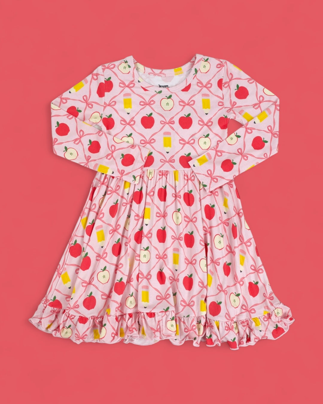 Twirls, ruffles, and a whole lot of charm! The Pencils & Bows Dream Ruffle Dress features a school-ready print of apples, pencils, and bows on a soft pink backdrop—perfect for first-day photos, teacher meet-and-greets, or just looking adorable every day. Made with buttery-soft fabric and finished with playful ruffle details, it’s comfy, cute, and top of the class in style!