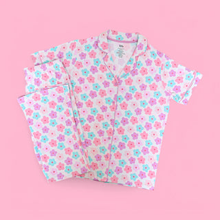 Step into springtime magic with the Violet Fields Dream Set, a delightful pajama set crafted for sweet dreams and cozy mornings. Featuring a vibrant floral print in pastel hues of pink, lavender, and mint, this two-piece ensemble is the perfect blend of charm and comfort.