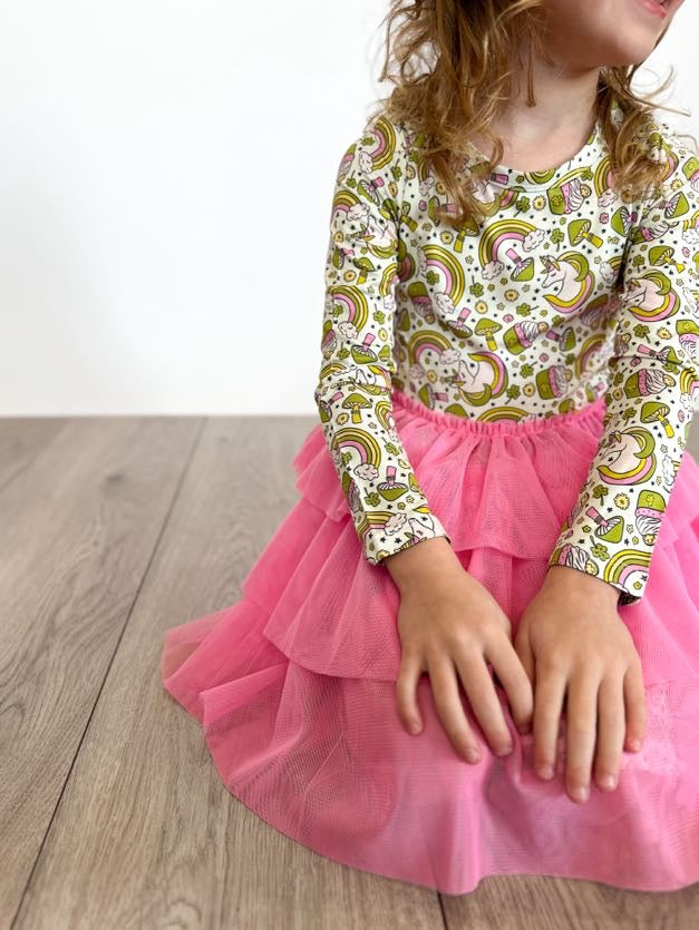 Unleash the magic with our Luck Of The Unicorn Dream Tutu Dress! This long sleeve tutu dress features a playful design of mushrooms, unicorns, and rainbows, perfect for celebrating St. Patrick's and beyond. And with its comfortable fit, your little one will be twirling and playing in style. A truly enchanting addition to any wardrobe!
