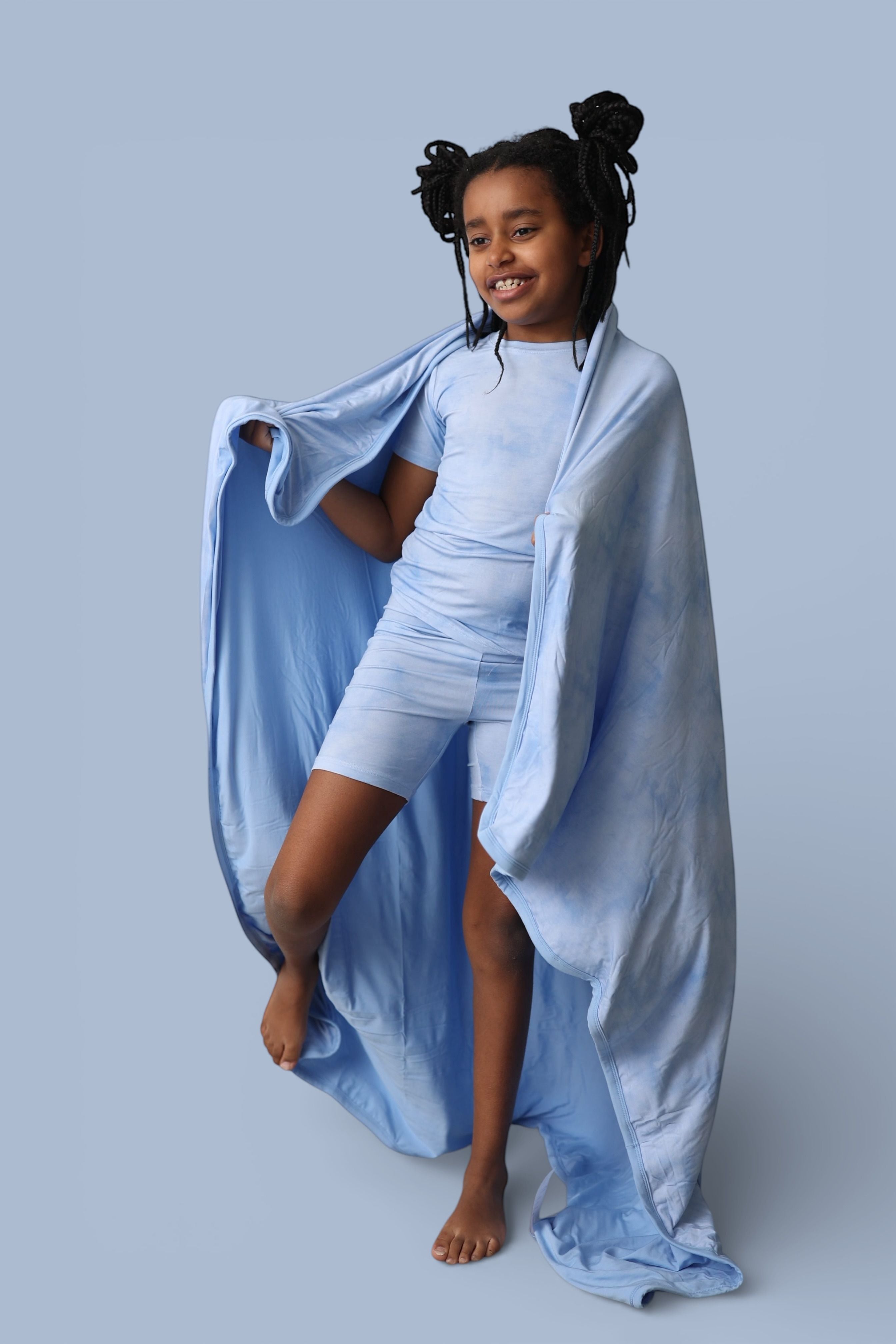 The Blue Haze Dream Blanket is a soothing essential made for cozy moments at home or on the go. Designed in a soft blue haze hue and crafted from our signature buttery-soft bamboo fabric, this blanket is breathable, gentle, and perfect for wrapping little ones in comfort.