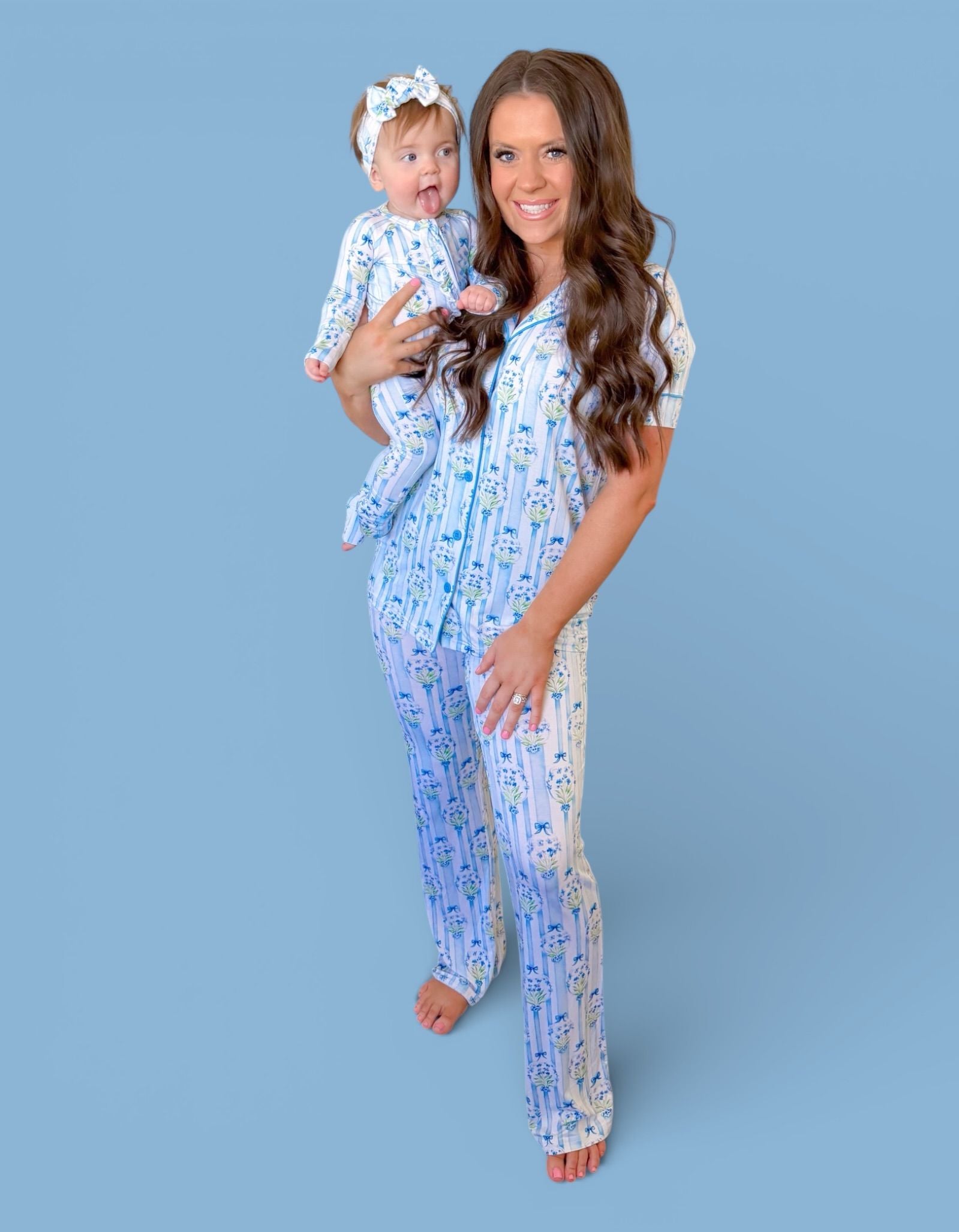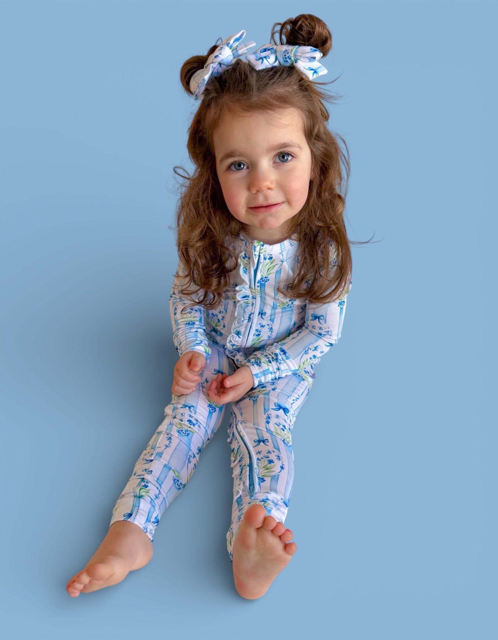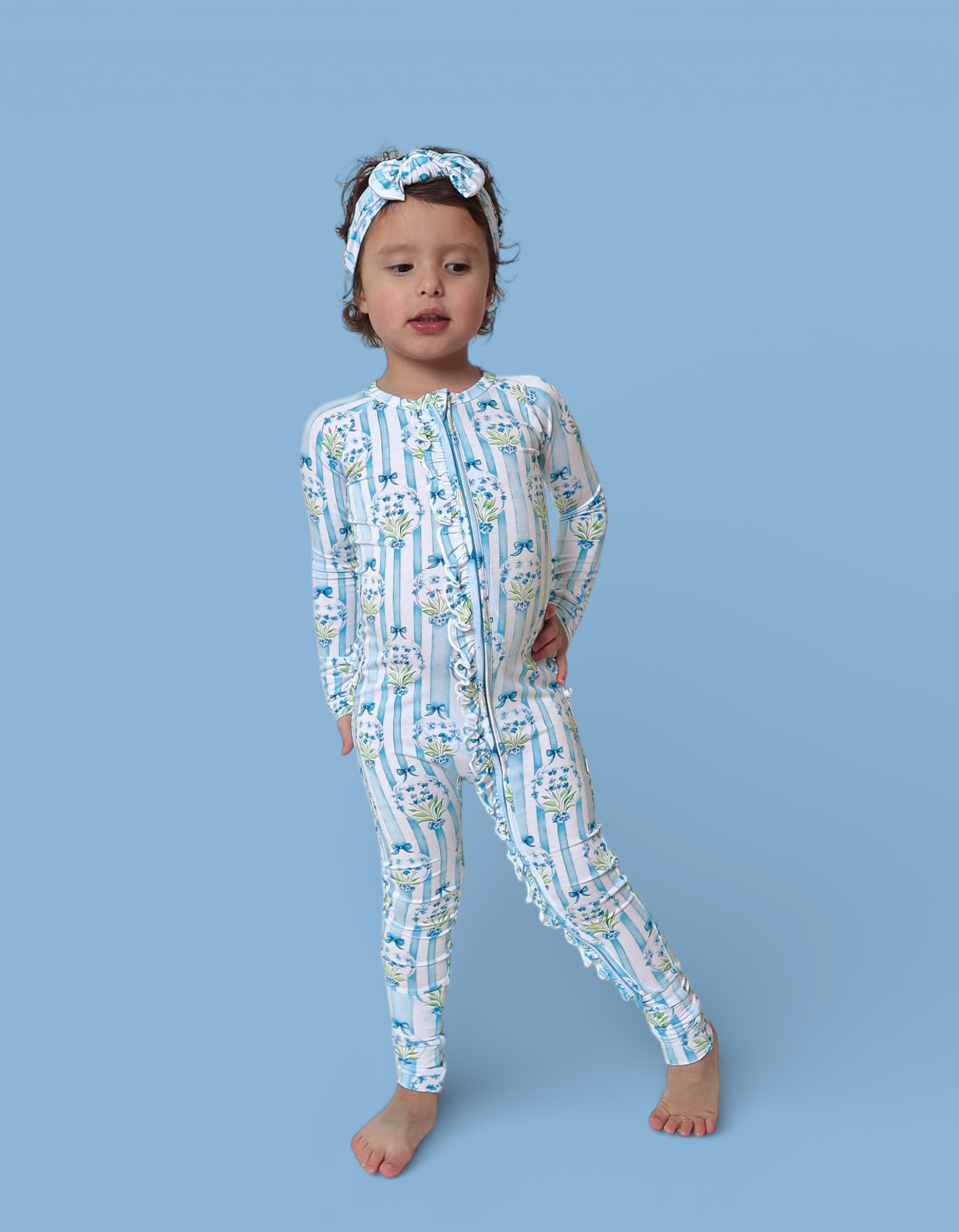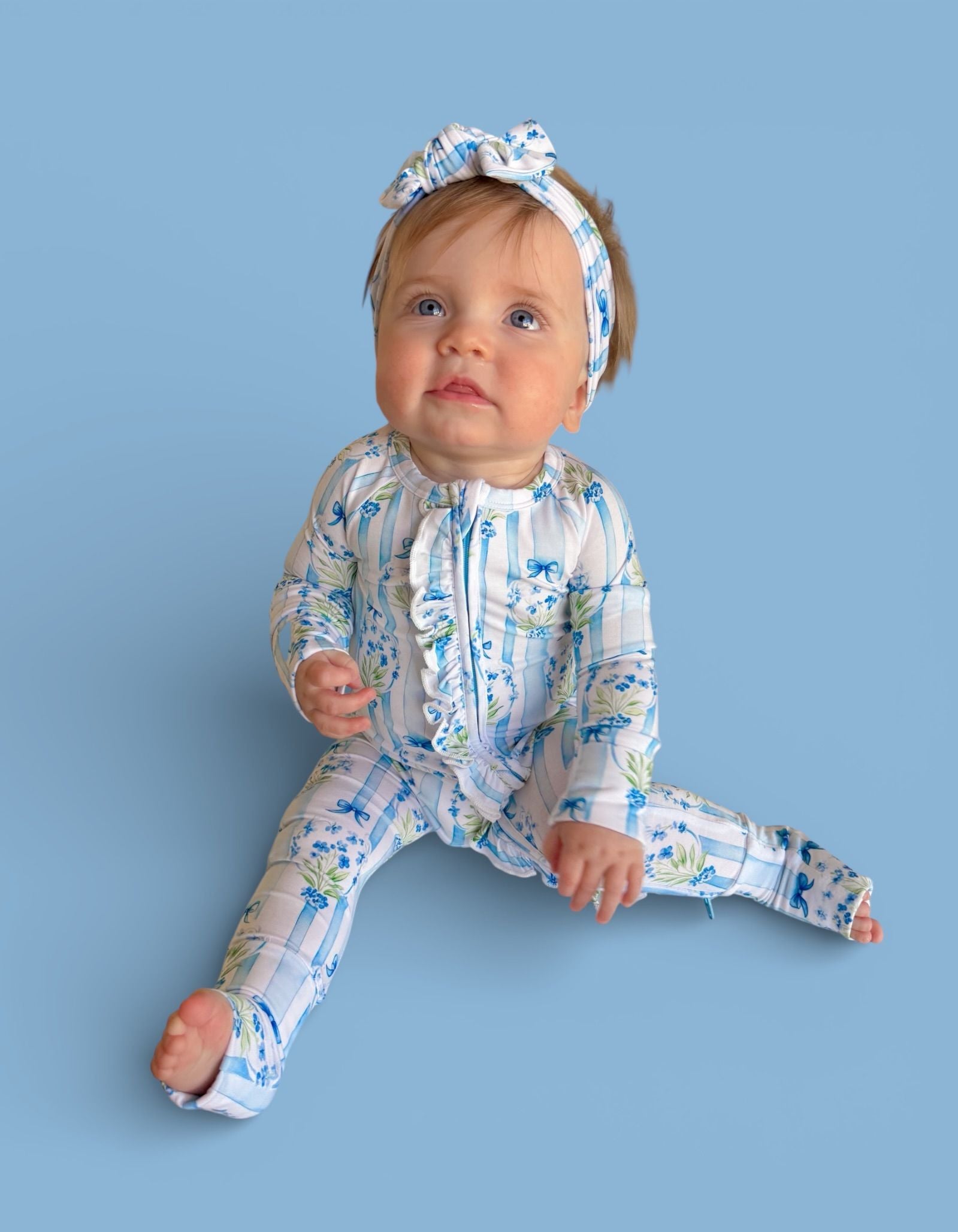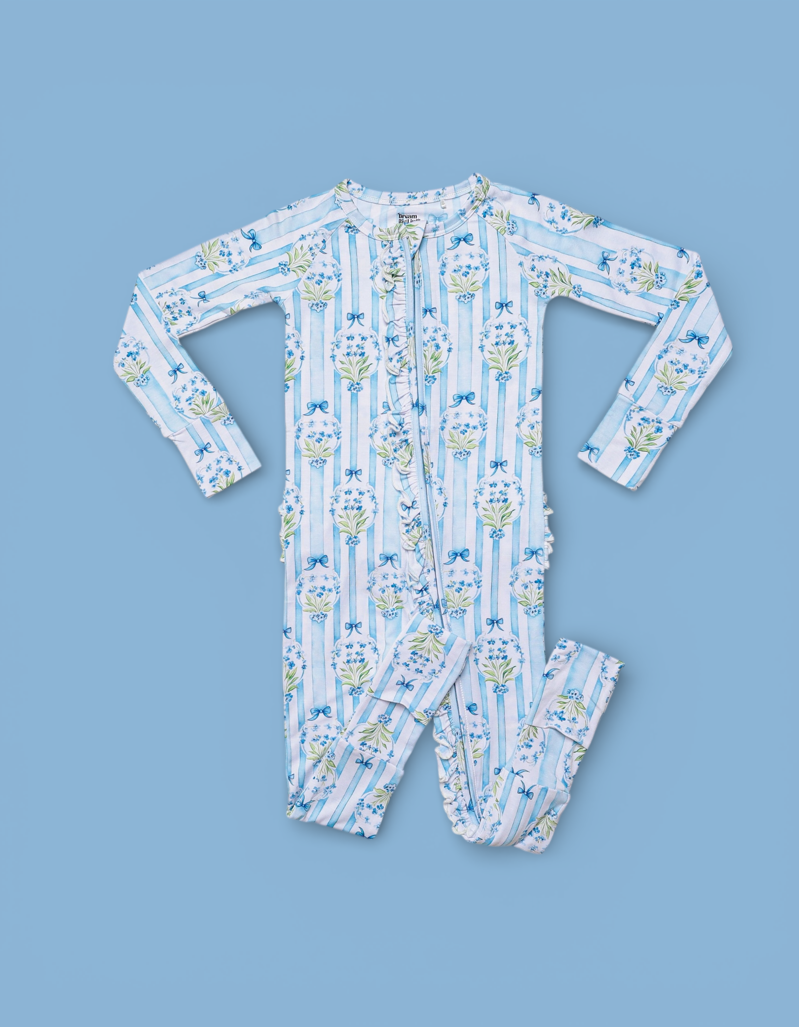 A timeless floral beauty made for spring memories. Our Heirloom Blue Blooms Dream Ruffle Romper features an elegant blue bouquet print with classic vertical stripes and sweet ribbon details — finished with dainty ruffles along the zipper and layered ruffles on the back for extra charm. A keepsake look perfect for Easter, portraits, and all things dainty + darling. ✨💐