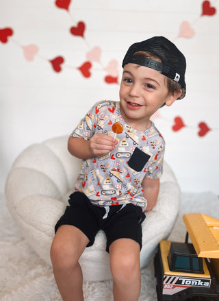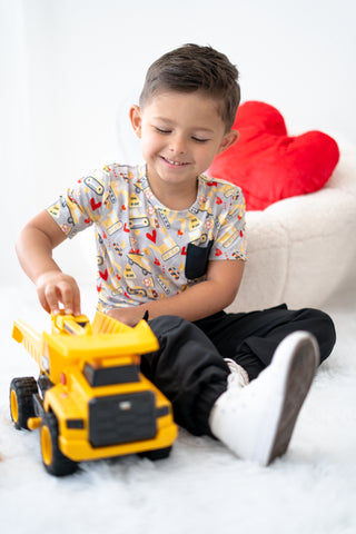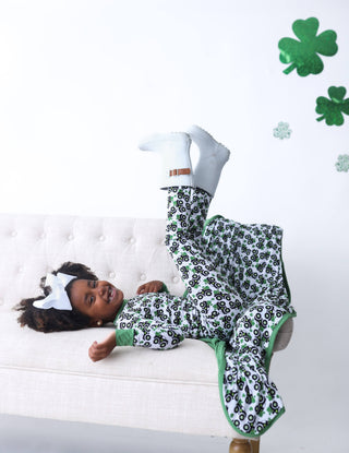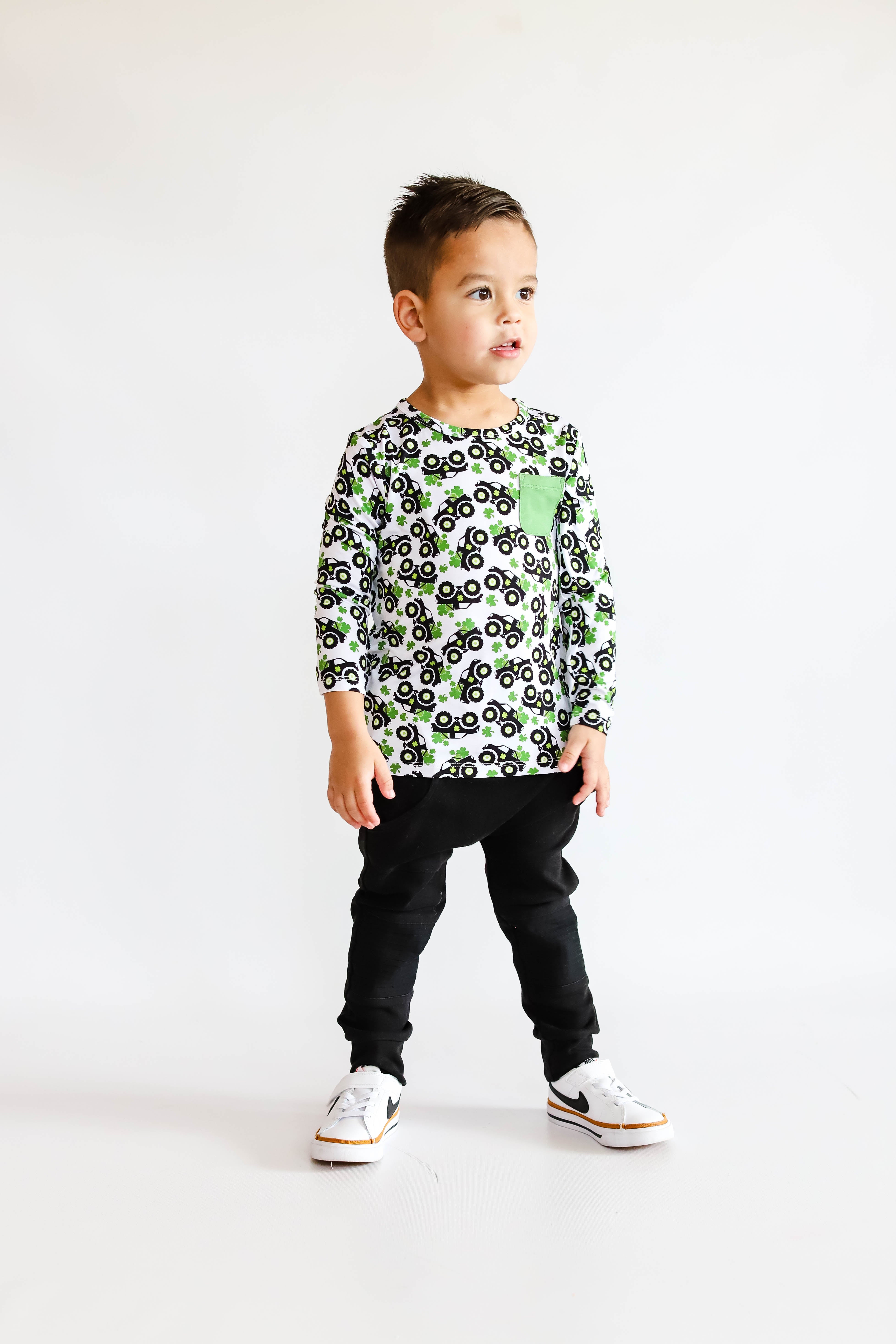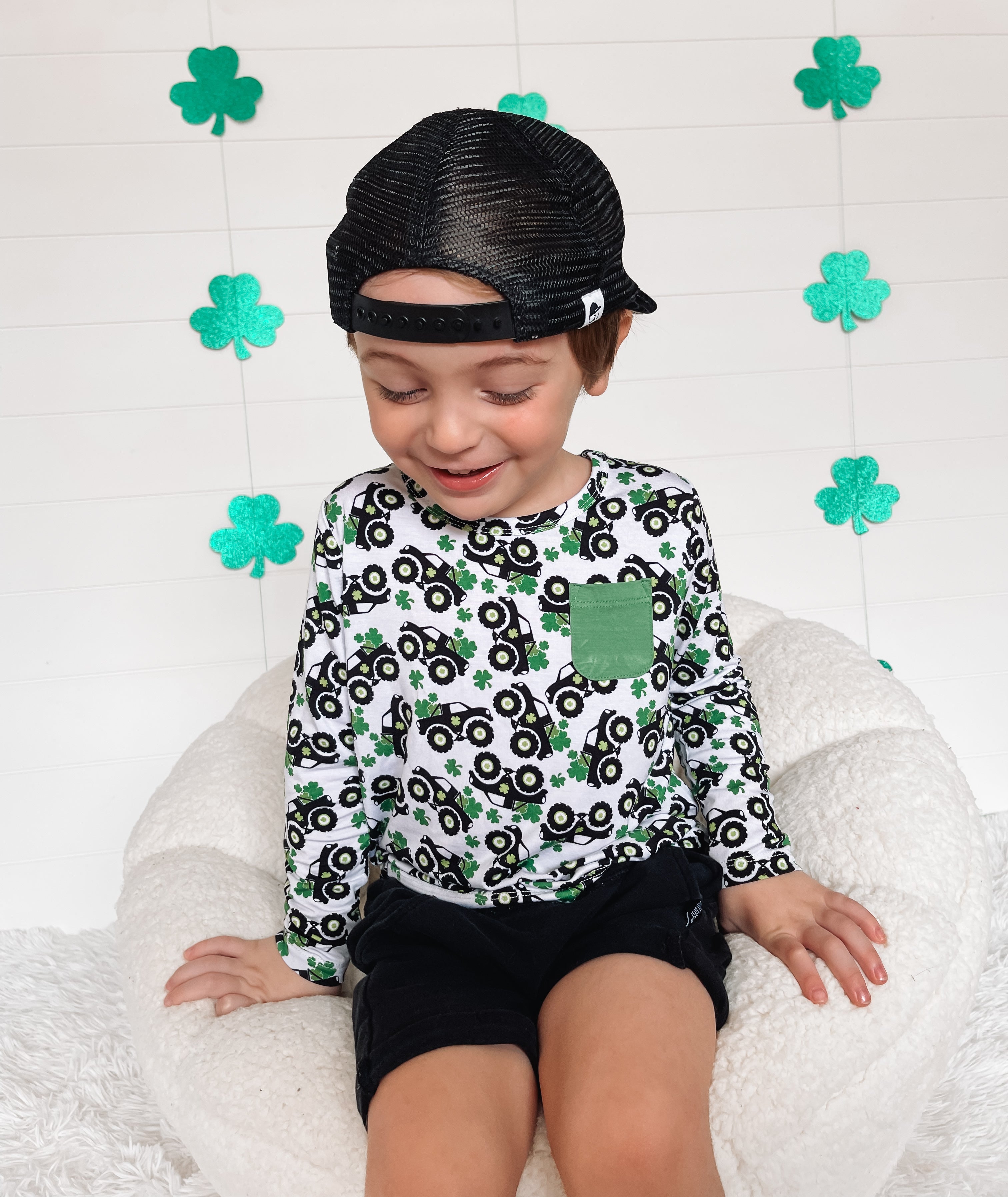 Get lucky with our Loads of Luck Dream Pocket Tee. This long sleeve tee features a playful St Patrick's design with shamrocks and trucks. Made from bamboo material, it's soft and comfortable for all day wear. Feel the luck in every step!
