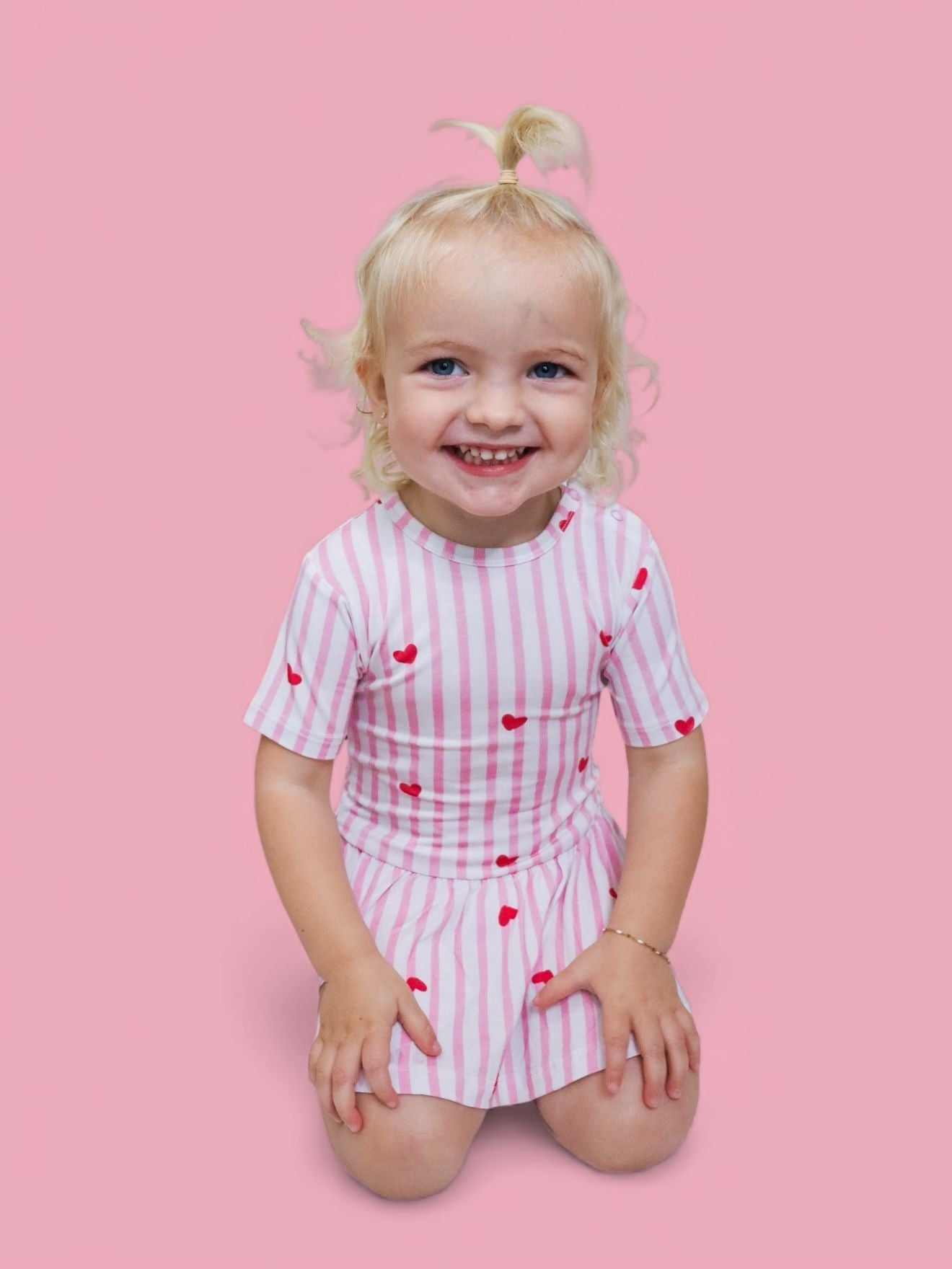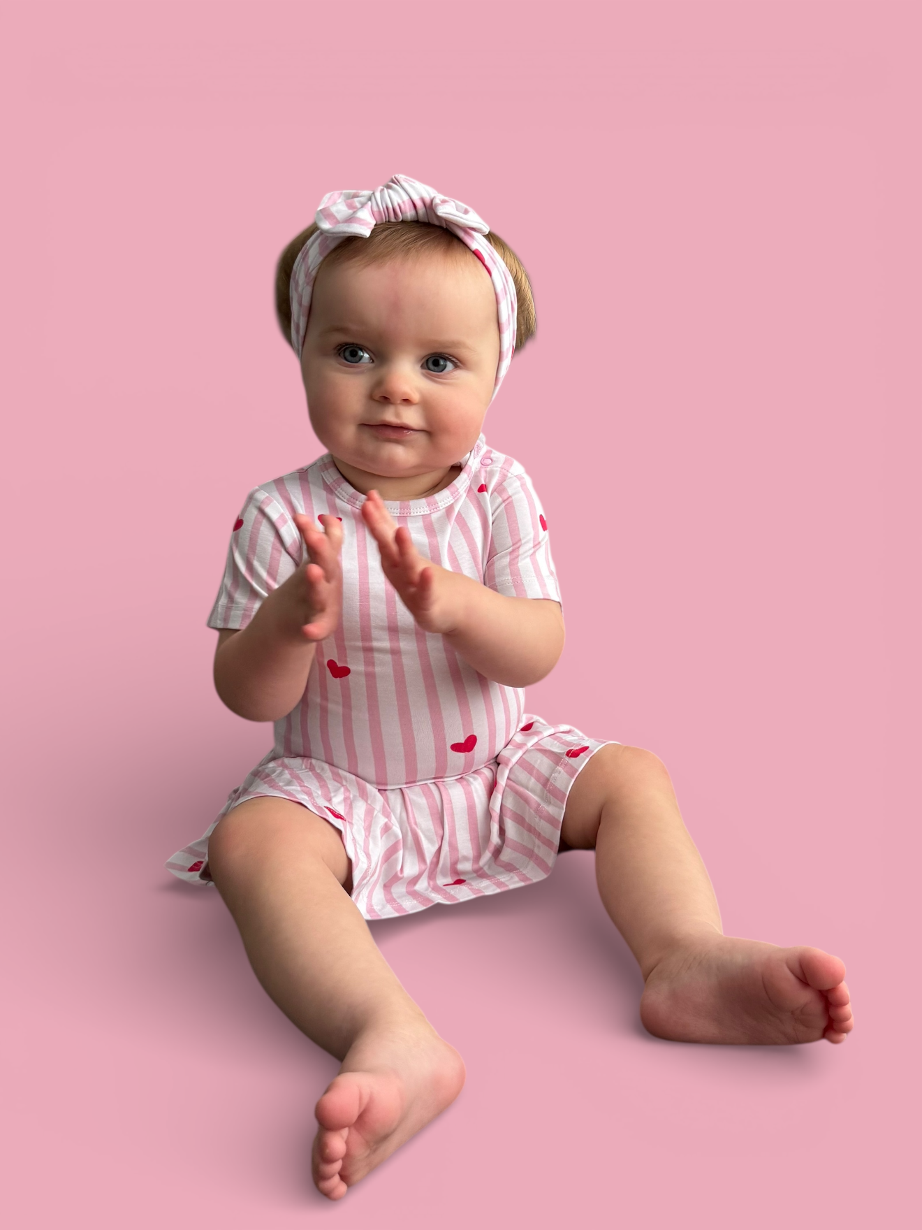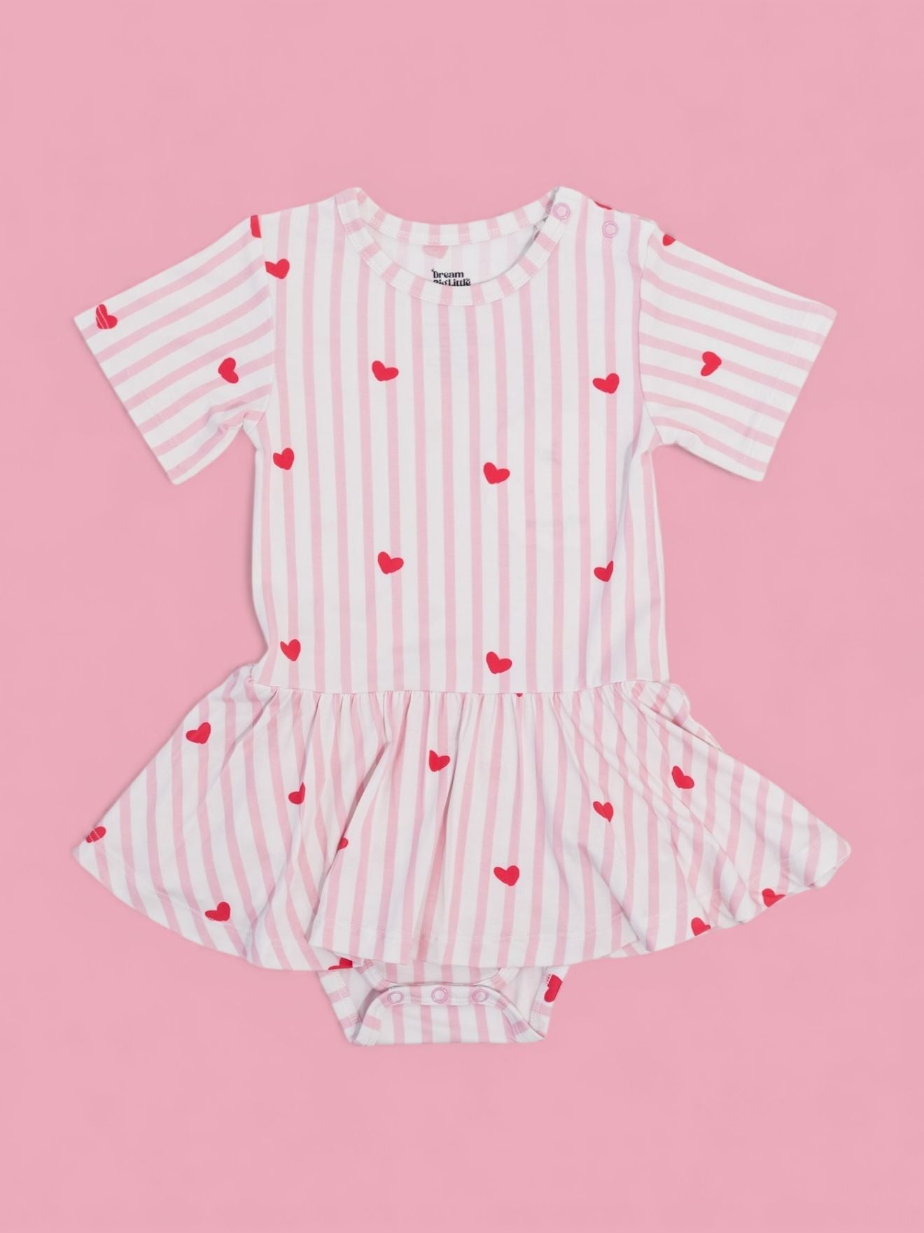 Your little one will look oh-so-sweet in our Sweetheart Stripes Dream Bodysuit Dress! This adorable piece combines the look of a fluttery dress with the practicality of a built-in bodysuit, making changes a breeze. Featuring playful pink-and-white stripes sprinkled with tiny hearts and crafted from our buttery-soft, breathable bamboo fabric, it’s perfect for twirling, playing, or layering.
