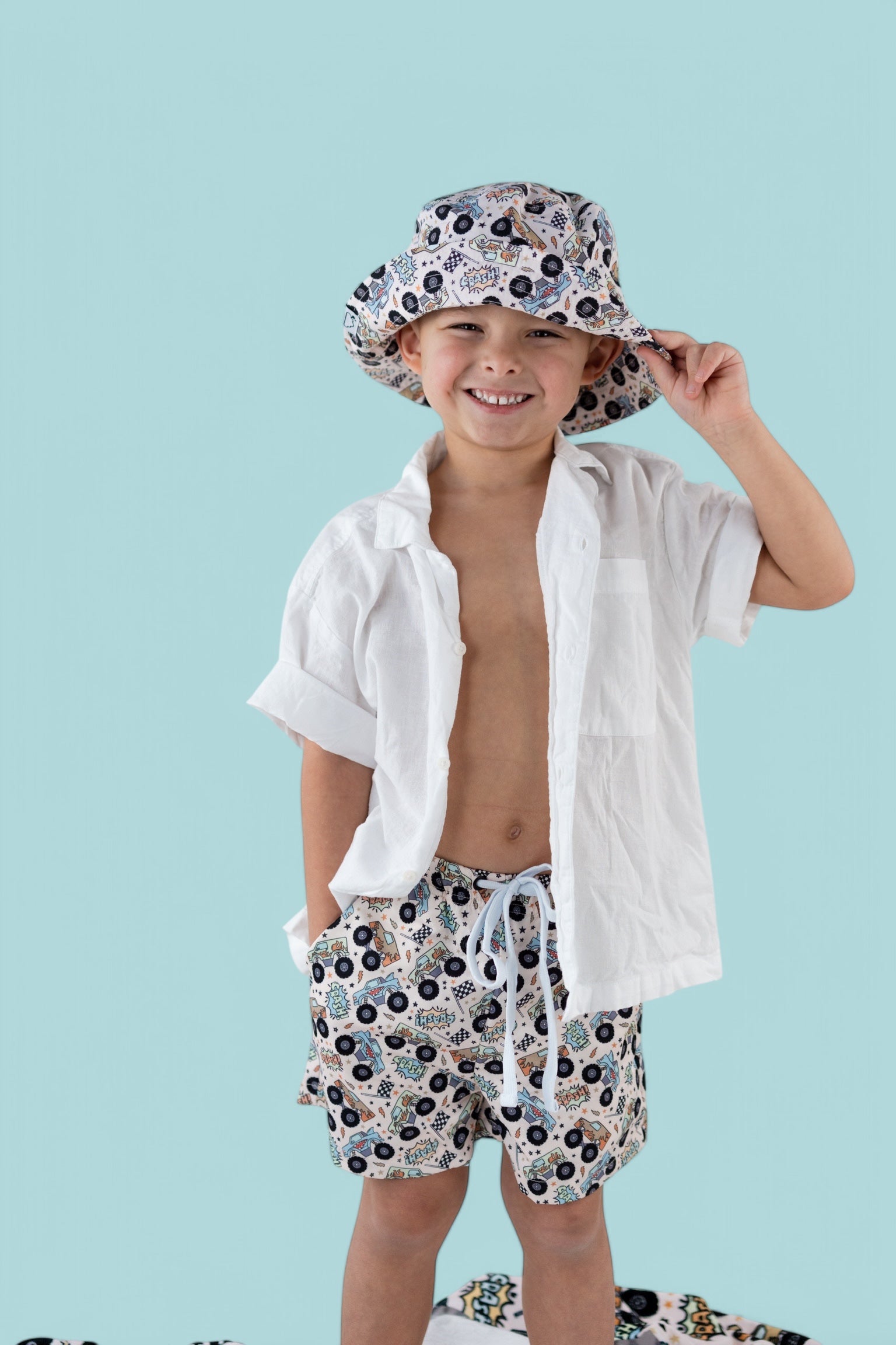 Crafted from ultra-soft bamboo viscose, this bucket hat promises a comfy, breathable fit your babe will adore. Available in Infant & Toddler sizes, it's the perfect hat to pair with our matching Swim Trunks and Towel for a beach day that’s nothing short of epic. Get ready for a wild ride with the Crash Hard Dream Bucket Hat!