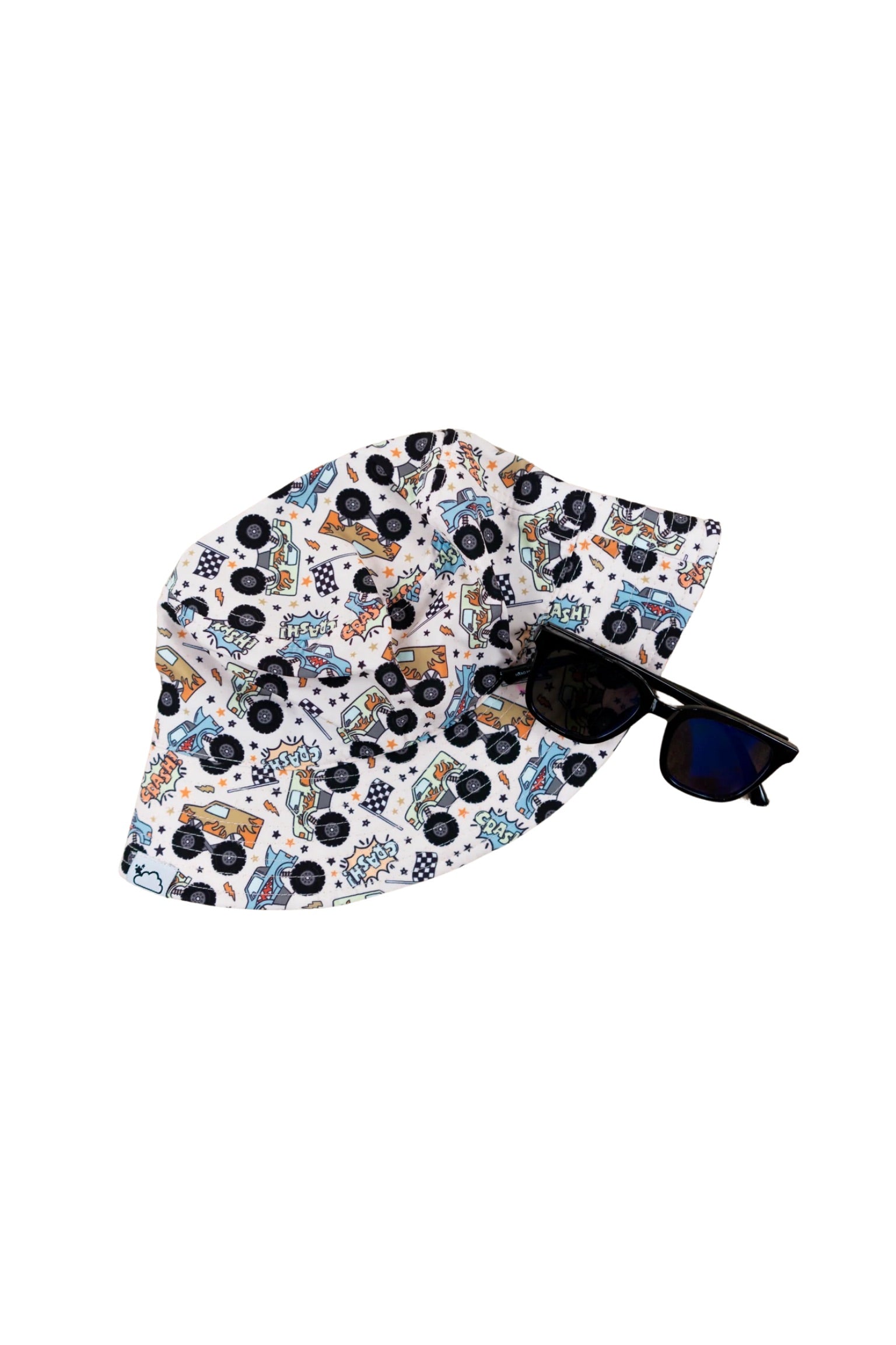 Rev up the fun with the Crash Hard Dream Bucket Hat! This action-packed accessory features an epic monster truck design, perfect for little daredevils who love adventure. Colorful monster trucks in bold blue, orange, and green race across the hat, complete with fierce flames and cool shark faces that add a splash of excitement. The word “CRASH!” zooms across in bold, comic-style lettering, setting the stage for high-speed fun!