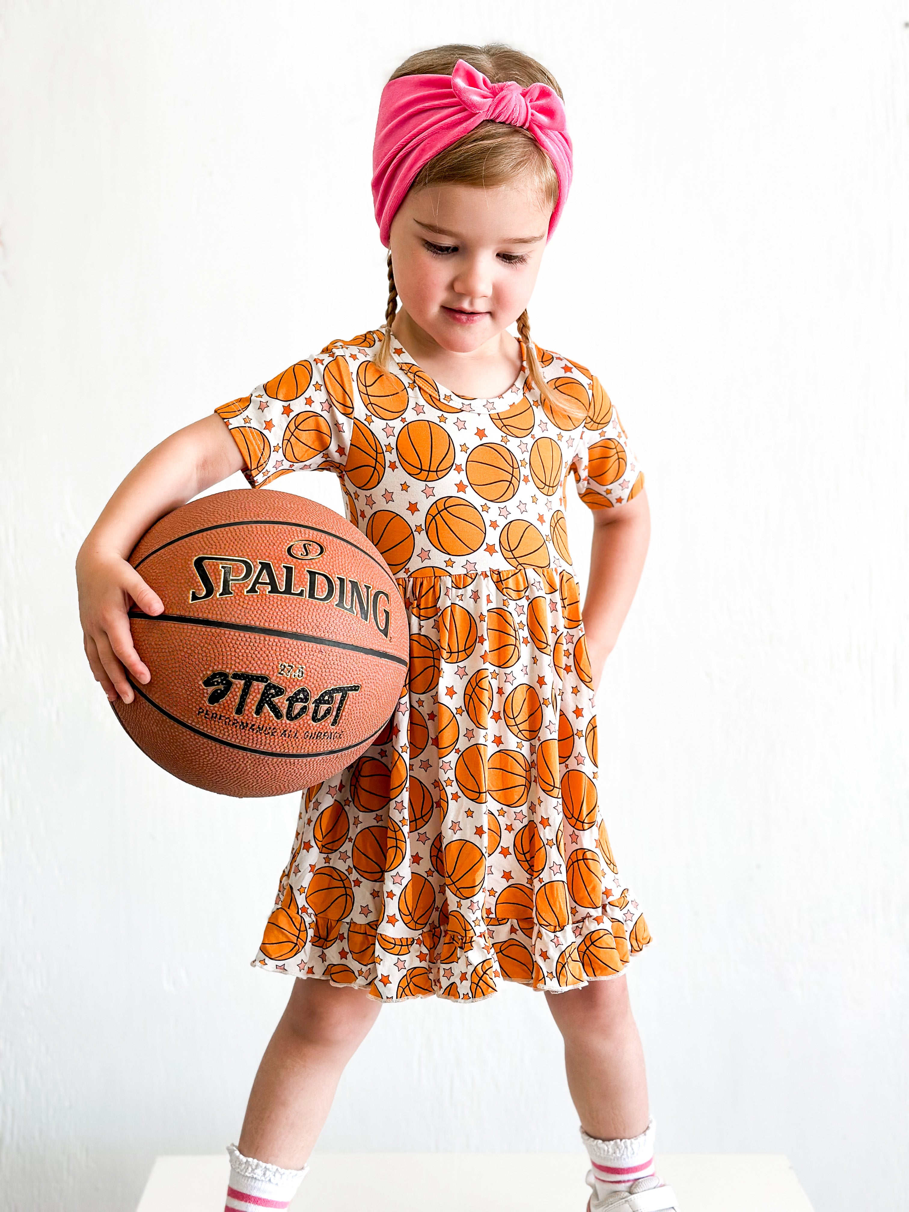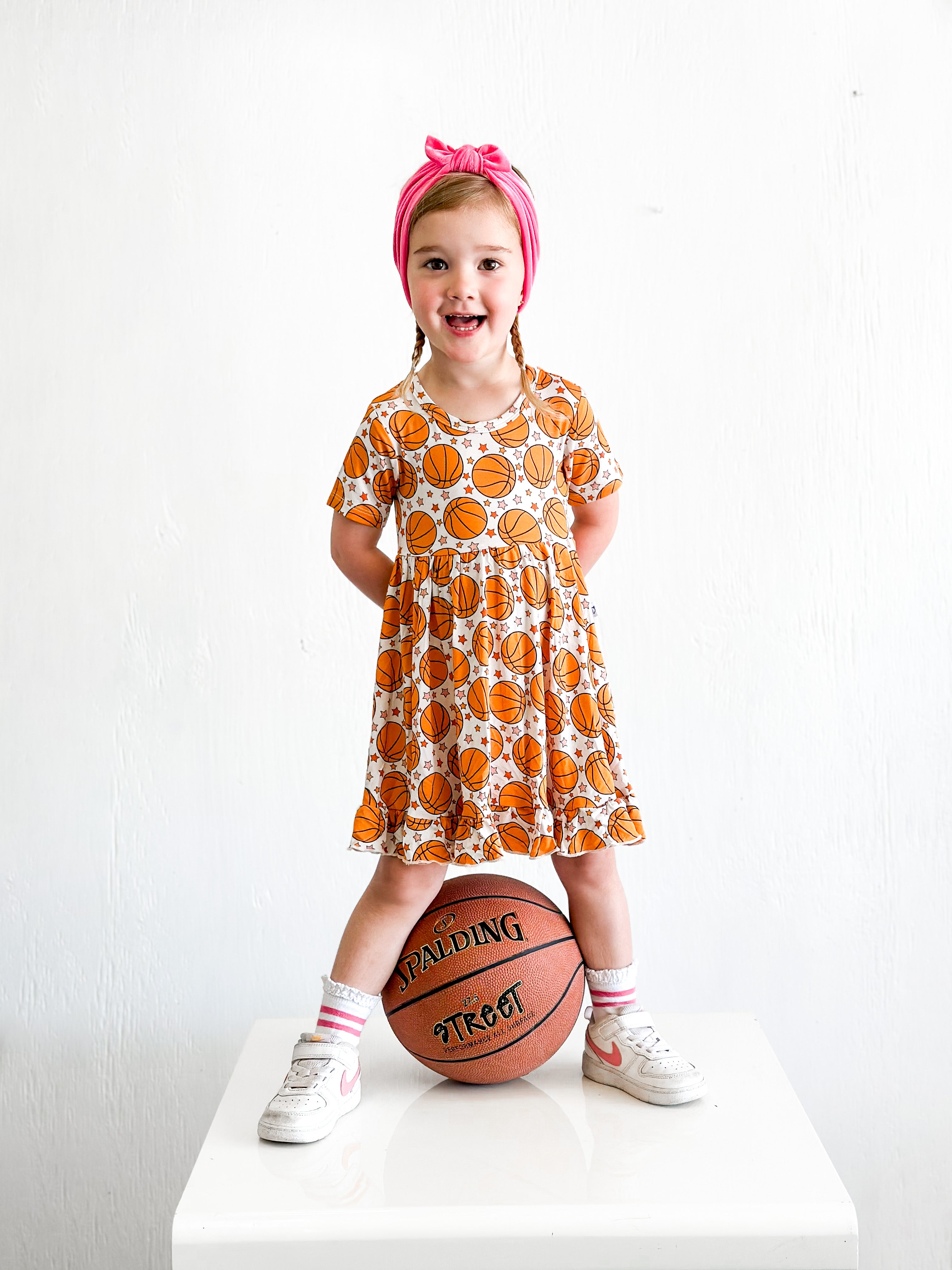 Ready to show off some court-ready style? Get your little sports fan ready for game time in our Dream Ruffle Dress! Featuring a fun basketball print and twirl-able short sleeves, she'll be ready to shoot (and score!) in comfort with the bamboo material. Let your little MVP shine on the court and off!