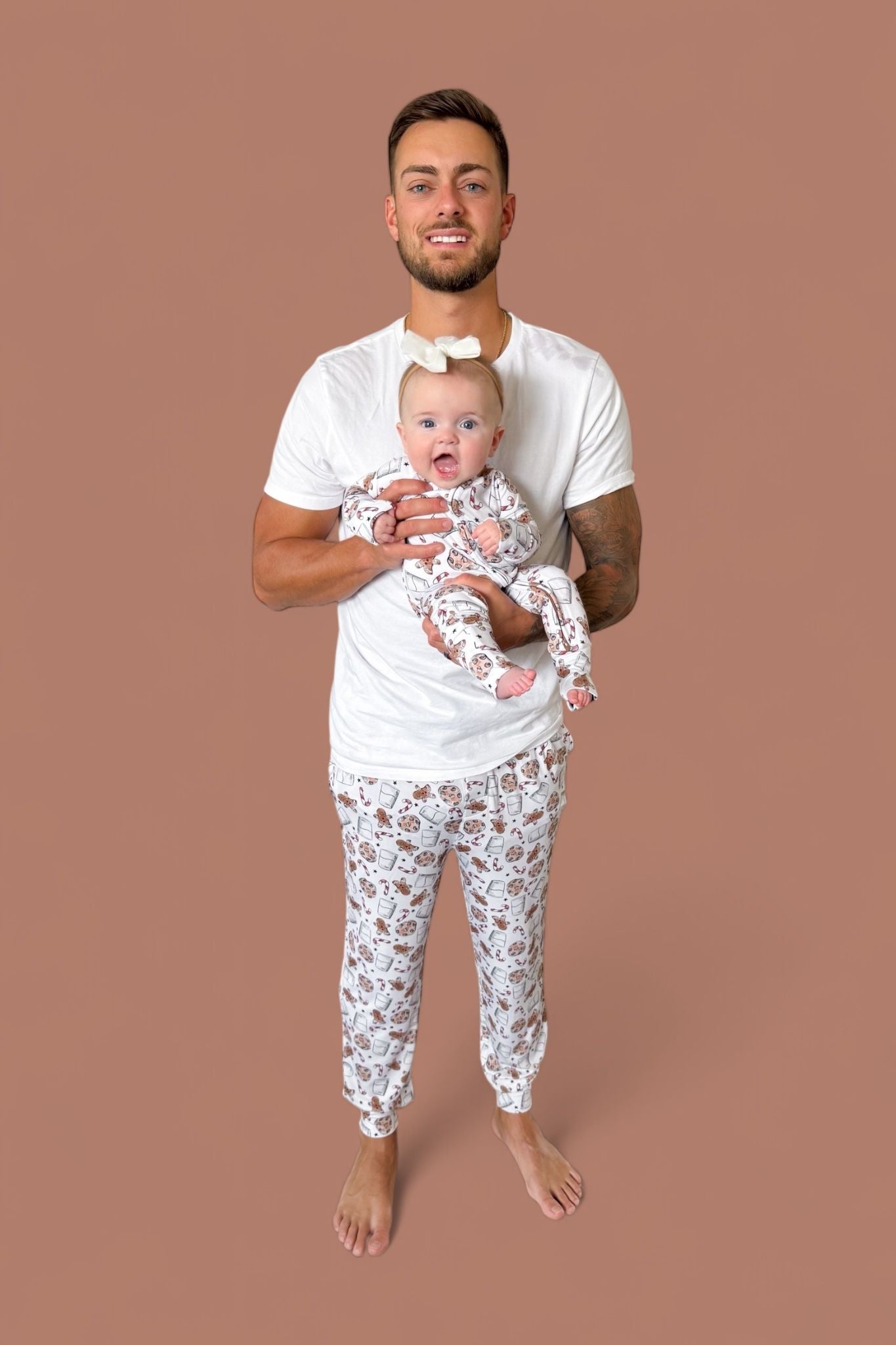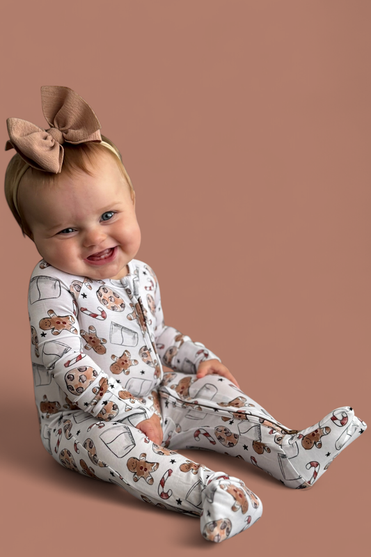 Sweet dreams are made of milk and cookies! Our Milk & Merry Dream Romper is bursting with festive fun—featuring playful gingerbread men, chocolate chip cookies, candy canes, and glasses of milk, all on our buttery-soft bamboo fabric. With fold-over cuffs, footies, and a double zipper for easy changes, this romper is perfect for cozy cuddles, cookie-baking days, and magical holiday nights. Let the merry moments begin!