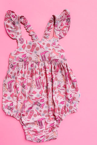 Channel your inner cowgirl and stay wild in our bubble romper! Made from soft bamboo material, this sleeveless romper features a fun Wild West theme. Perfect for those who want to stand out in a crowd. Yeehaw!