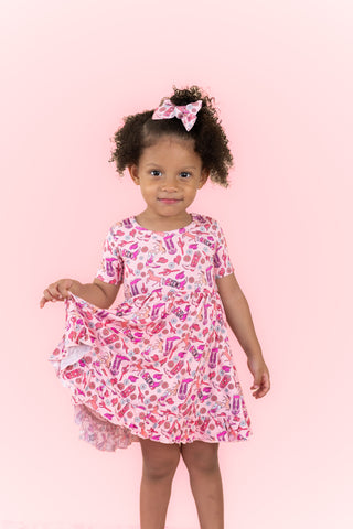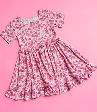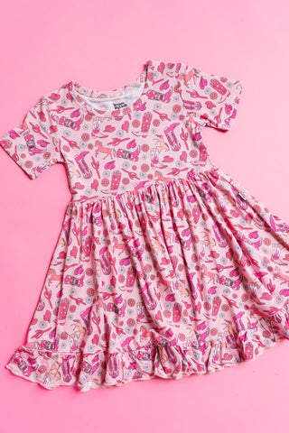 Yeehaw! Get ready for some wild adventures in our Stay Wild Cowgirl Dream Ruffle Dress. Made with soft bamboo material, this short sleeve dress features a fun cowgirl print with boots, horses, and a cowgirl hat. Perfect for little cowgirls who love to stay wild and free. Giddy up!